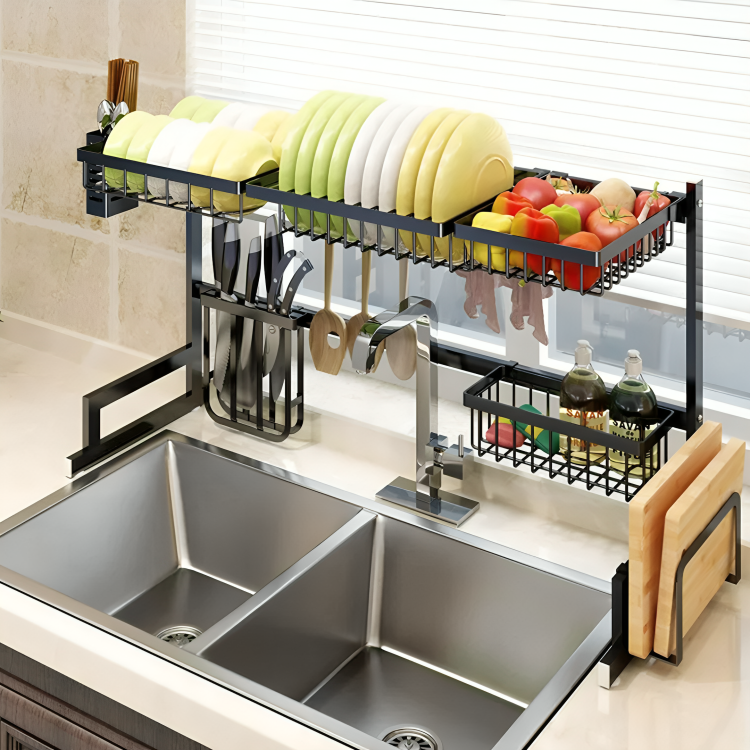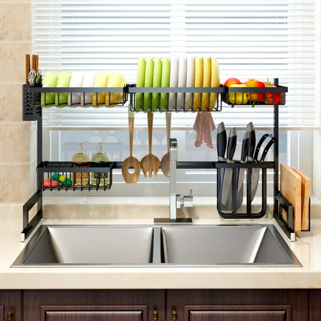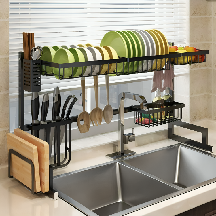 Este escurridor no solo organiza tus utensilios de cocina, sino que también agrega un toque de funcionalidad. Los múltiples accesorios incluidos permiten un almacenamiento eficiente, manteniendo todo al alcance de tu mano mientras cocinas.